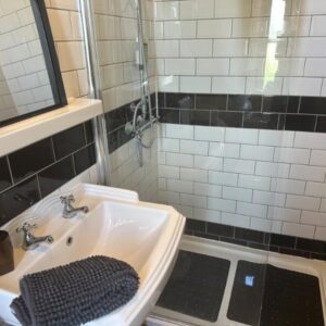 En-Suite Bathroom 4.12 x 1.33m Half-tiled walls. Velux window to east elevation. Sloping ceiling. Pedestal basin. Large shower cubicle. Claw-foot cast-iron bath with mixer tap. WC. Cupboard housing hot water cylinder.